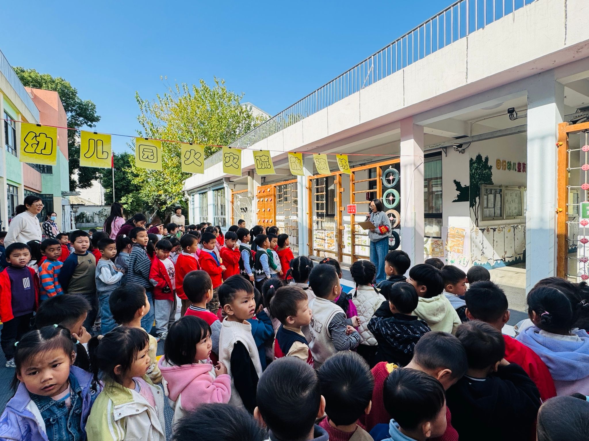 2025年11月10日,金塘幼儿园在园领导的周密安排与全体教职工的齐心协作下,顺利举行了消防安全应急疏散演练活动。此次活动的目标在于提升全园师生的消防安全意识,强化面对火灾等突发状况时的自救与互救能力,确保在真实火灾来临时,能够快速、有序地实施疏散,最大程度地保障师生的生命安全。