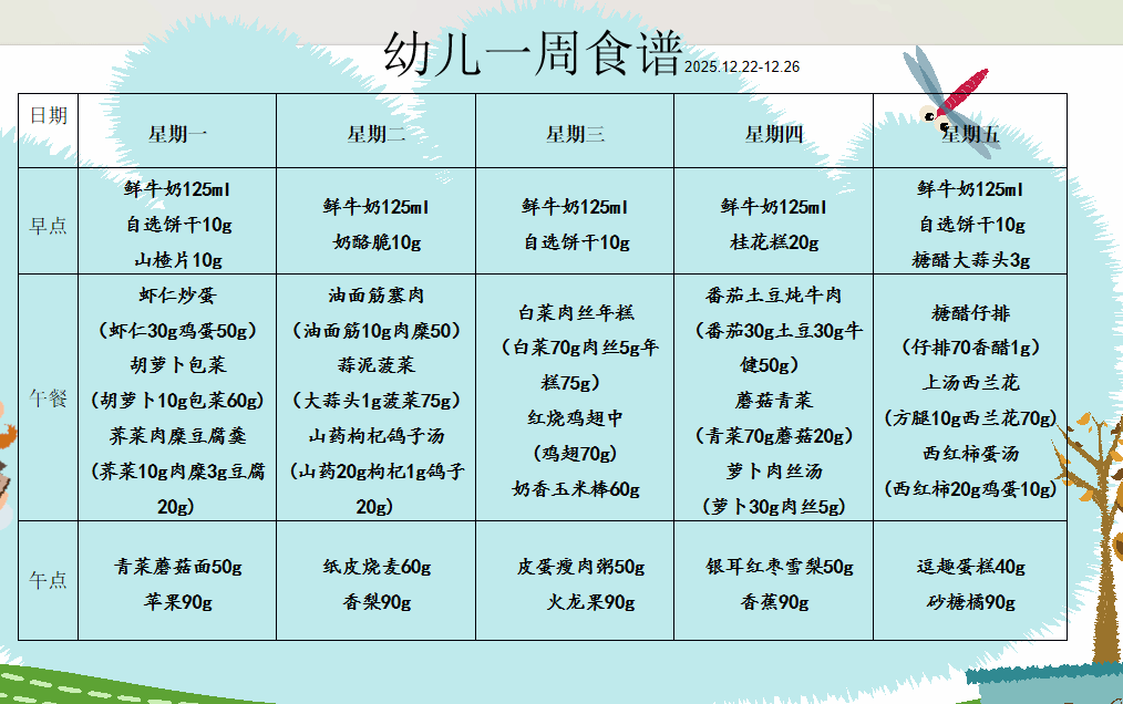 2025年12月22日-2025年12月26幼儿食谱